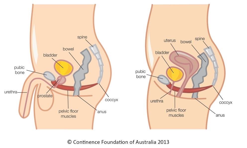 The pelvic floor is made up of a layer of muscles covering the bottom of the pelvis that support the bladder and bowel in men and bladder, bowel and womb in women. These structures that sit on top of the pelvic floor are known as our pelvic organs. The muscles run like a hammock from the front of the pelvis to the tailbone (coccyx) at the back, and side-to-side from one sitting bone to the other.